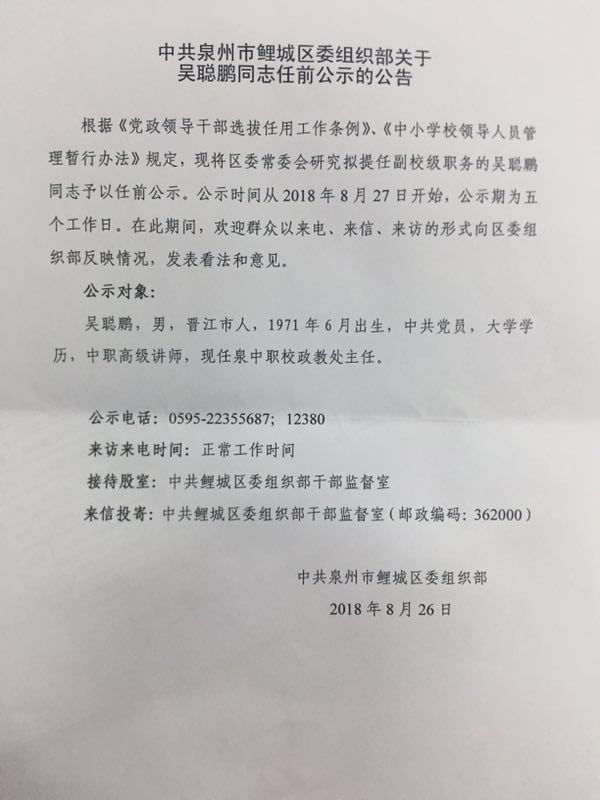 中共鯉城(chéng)區(qū)委組織部關于吳聰鵬同志(zhì)任前公示的(de)公告