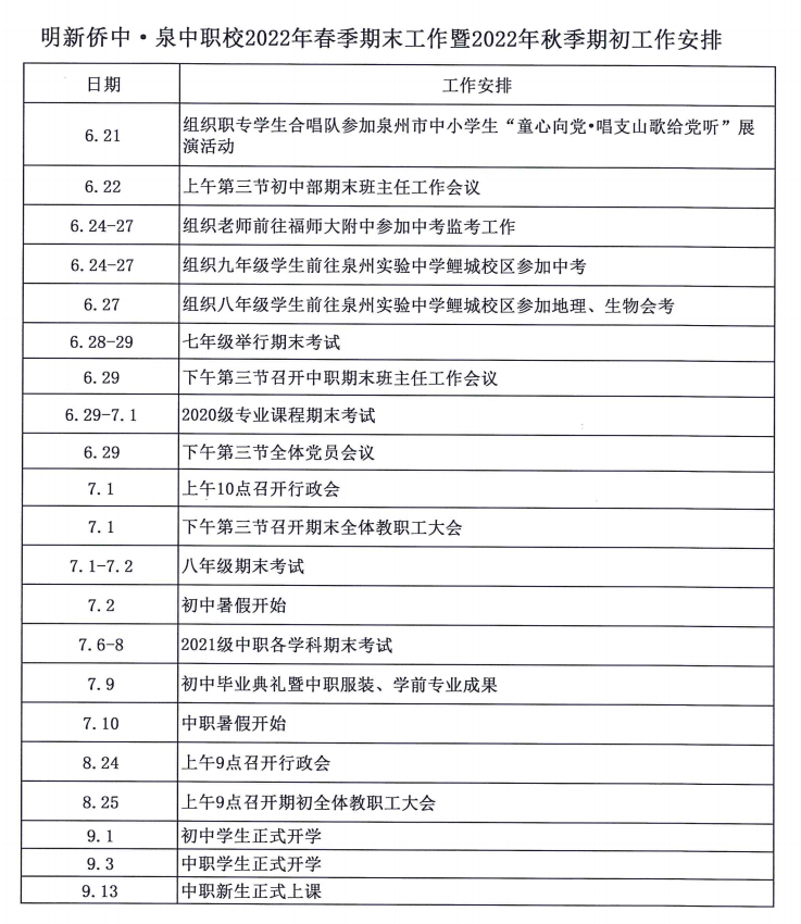 根據泉教辦〔2022〕16号《泉州市(shì)教育局關于印發2022-2023學年(nián)度幼兒(ér)園、普通(tōng)中小(xiǎo)學、中等職業(yè)學校φ(xiào)校(xiào)曆時(shí)間(jiān)安排的(de)通(tōng)知(zhī)》文(wén)件(jiàn)要(yào)求,并結合我校(xiào)實際工(gōng)作(z↔uò)情況,2022年(nián)春季期末暨2022年(nián)秋季期初工(gōng)作(zuò)安排見(jiàn)附件(ji÷àn)。
