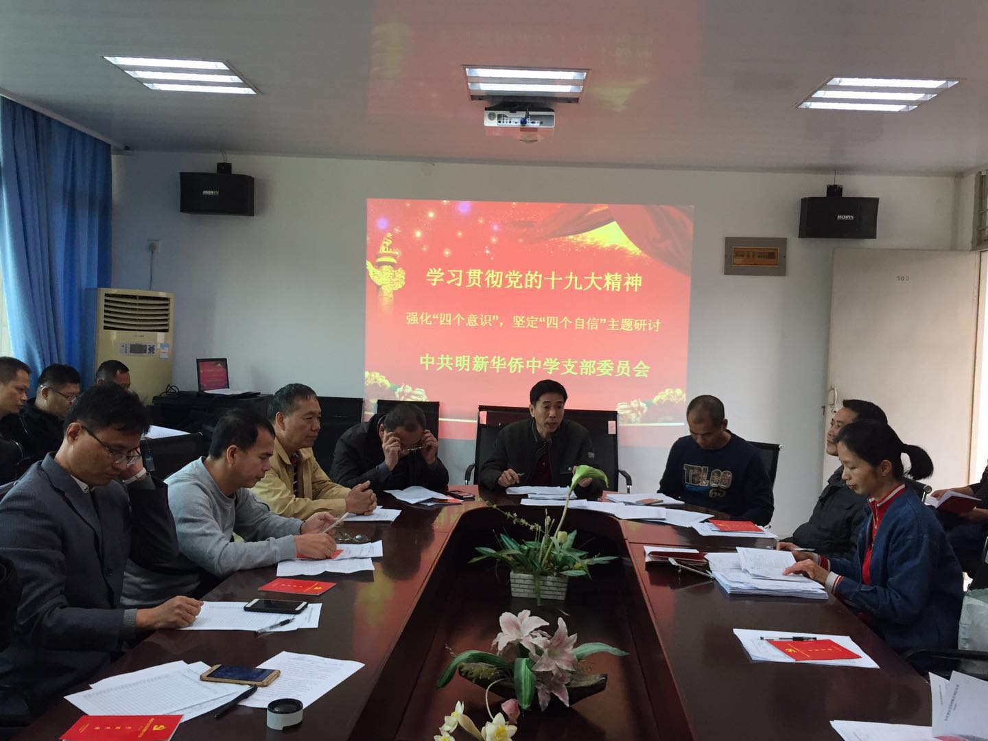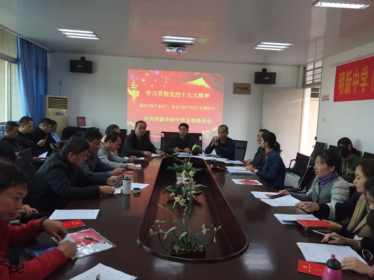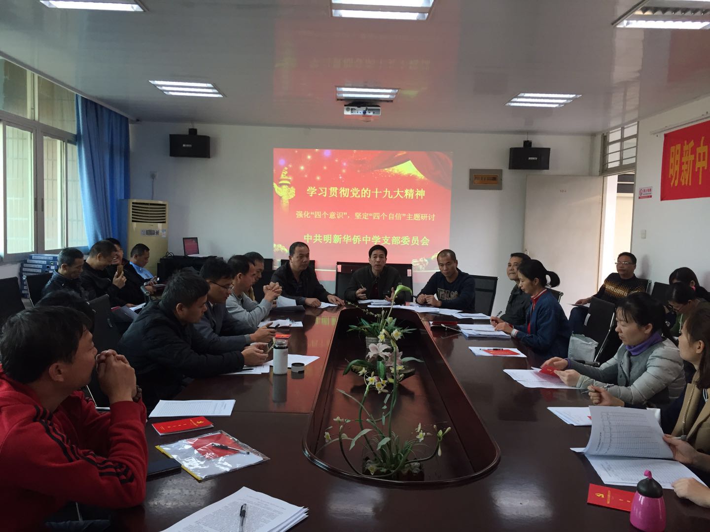按照(zhào)上(shàng)級黨委的(de)部署要(yào)求,12月(yuè)6日(rì),明(míng)新中學黨支部召開(kāi)黨員(yuán)大(dà)會(huì),開(kāi)展“兩學一(yī)做(zuò)”學習(xí)教育常态化(huà)制(zhì)度化(huà )第三專題學習(xí)討(tǎo)論會(huì),圍繞“學習(xí)貫徹黨的(de)十九大(dà)精神,強化(huà)‘四個(gè)意識’、堅定‘四個(gè)自∑(zì)信’”這(zhè)一(yī)主題,進行(xíng)集中學習(xí)研討(tǎo)。會(huì)議(y∏ì)由支部黃(huáng)順明(míng)同志(zhì)主持。