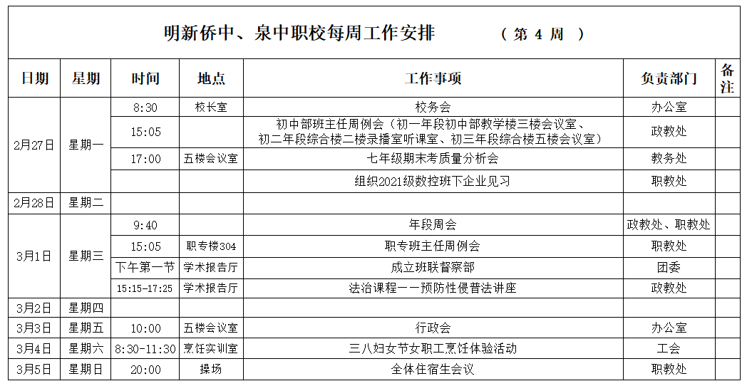 【02月(yuè)27日(rì) 星期一(yī)】 2023年(nián)春季第4周工(gōng)作(zuò)安排