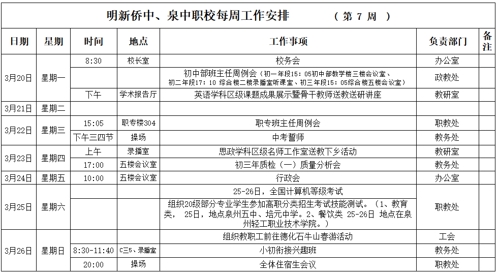 【03月(yuè)20日(rì) 星期一(yī)】 2023年(nián)春季第7周工(gōng)作(zuò)安排