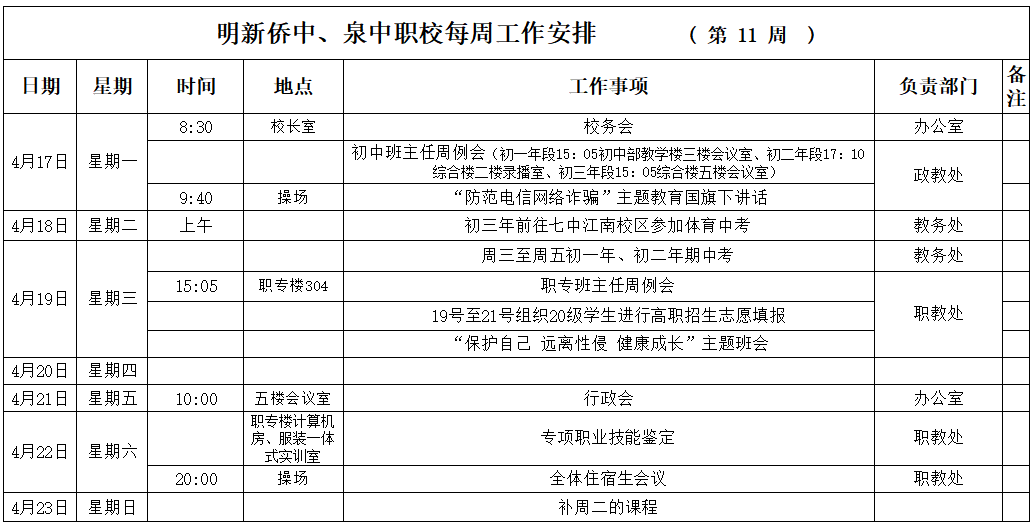 【04月(yuè)17日(rì) 星期一(yī)】 2023年(nián)春季第11周工(gōng)作(zβuò)安排