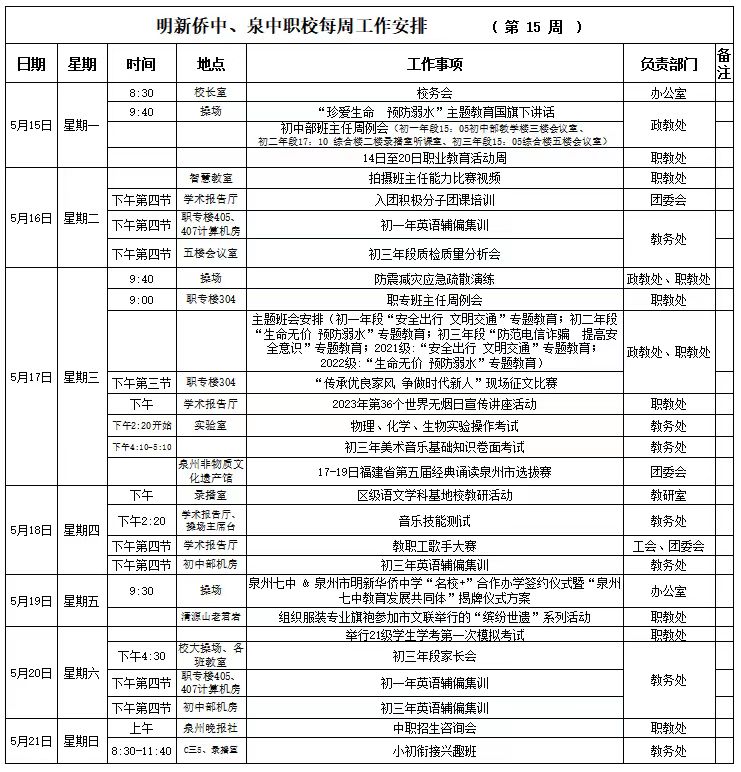 【05月(yuè)15日(rì) 星期一(yī)】 2023年(nián)春季第15周工(gōng)作(zuò)安排