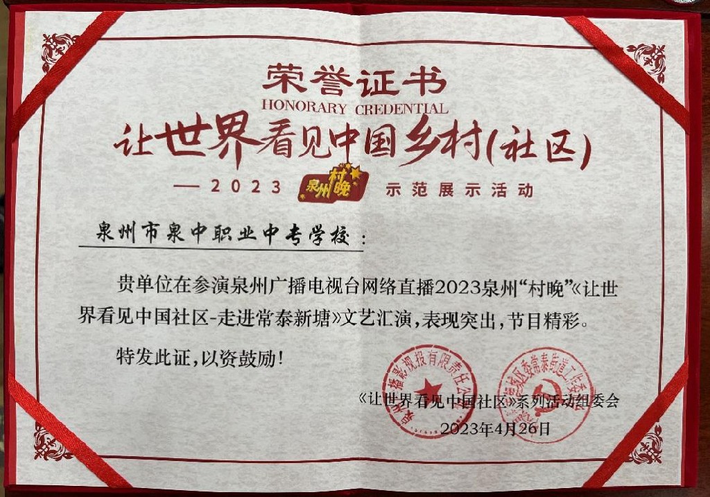 泉州市(shì)明(míng)新中學黨支部由吳聰鵬副書(shū)記帶領師(shī)生(shēng),走進常泰街(jiē)道(dào)新塘社區(qū),參加讓世界看(kàn)見(jiàn)中國(guó)鄉(xiāng)村(cūn)(社區(qū))&·走進常泰新塘——2023泉州“村(cūn)晚”示範展示活動。我校(xiào)流行(xíng)舞(wǔ)社團成員(yuá n)參與表演,節目精彩受到(dào)主辦方及鄉(xiāng)民(mín)們一(yī)緻好(hǎo)評,對(duì)我校(xiào)的(de)辦學特色,以及學生(shēng)的(de)精ε神面貌贊賞有(yǒu)加。