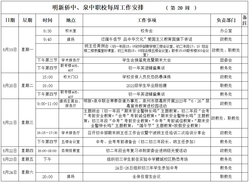 【06月(yuè)19日(rì) 星期一(yī)】 2023年(nián)春季第20周工(gōng)作(zuò)安排