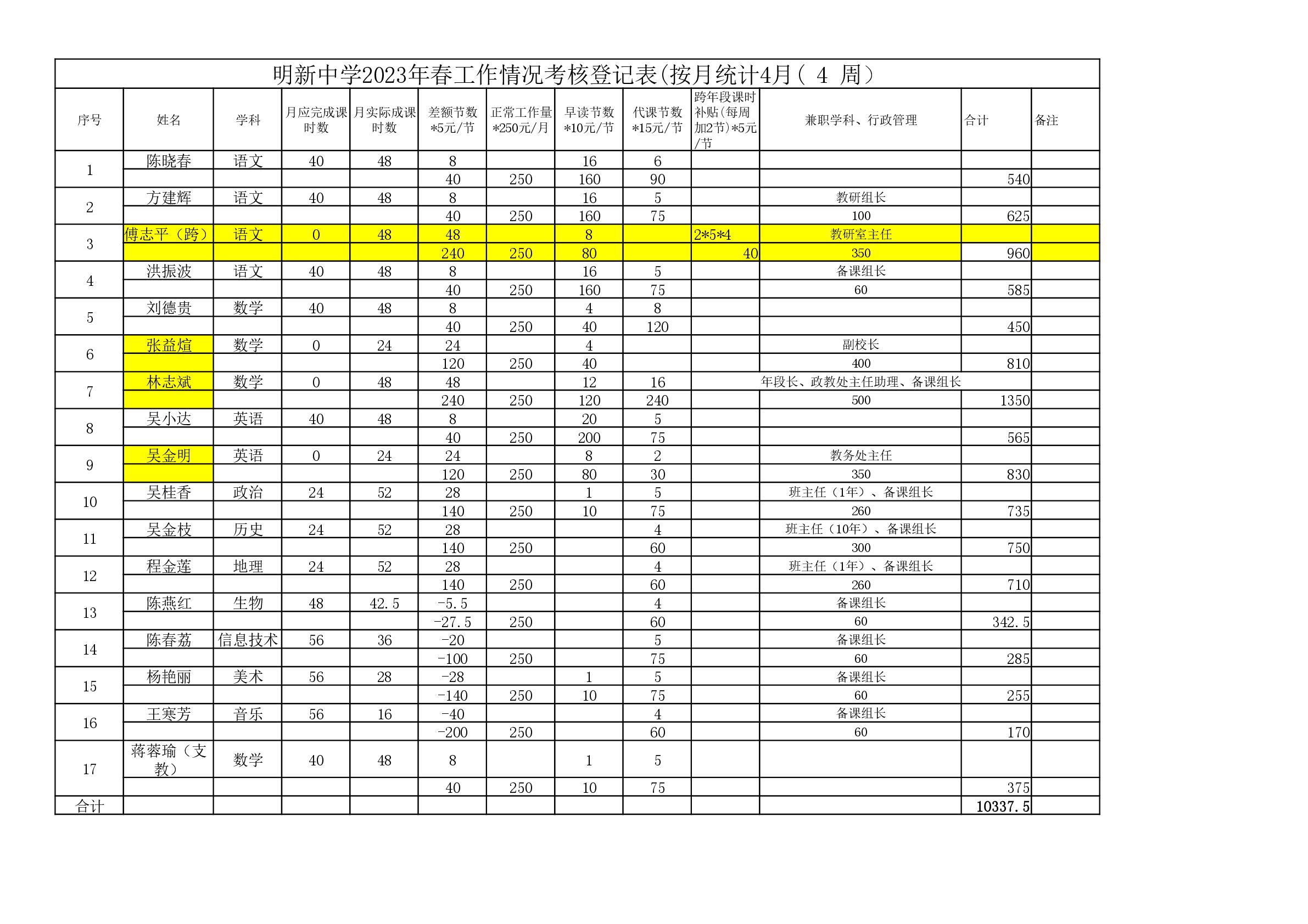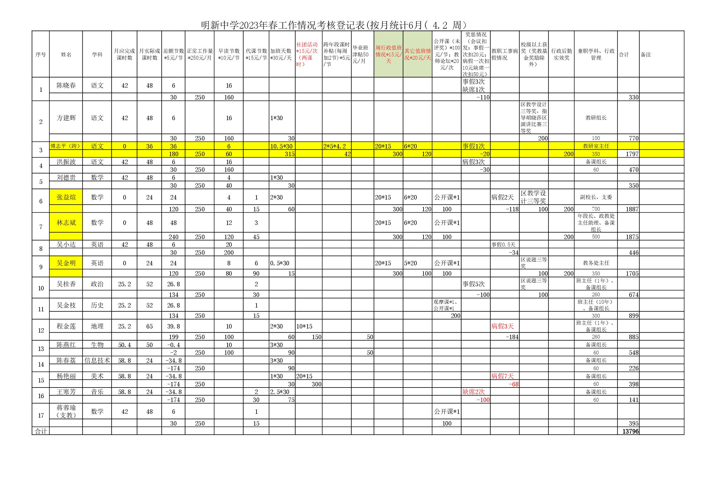 2023春在編教師(shī)七年(nián)級績效統計(jì)表1-6月(yuè)