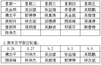 1.工(gōng)作(zuò)日(rì)值班:總巡視(shì):劉偉傑