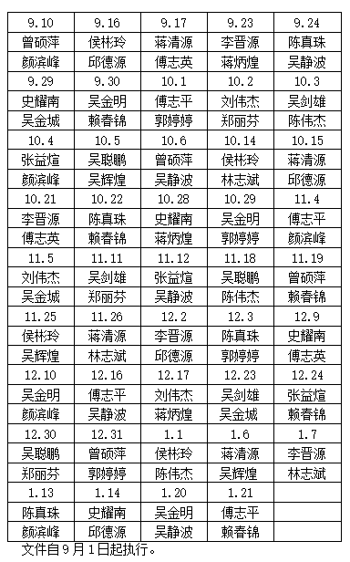 為(wèi)了(le)确保2023年(nián)秋季學期教學各項工(gōng)作(zuò)順利開(kāi)展,經學校(xiào)行(xíng)政會(huì)研究決定,2023年(nián)秋季學期行(xíng)政人(rén)員(yuán)值班安排如(rú)下(xià):