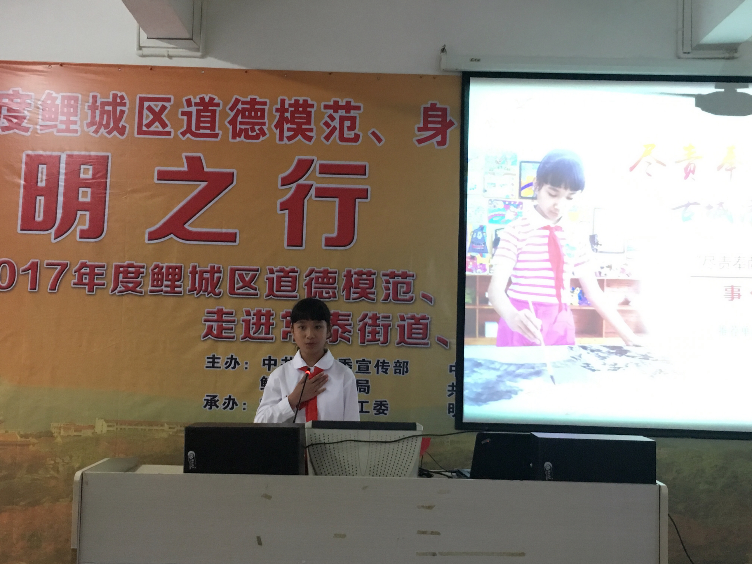 來(lái)自(zì)通(tōng)政中心小(xiǎo)學的(de)學生(shēng)吳芷曦現(xià∑n)場(chǎng)分(fēn)享她(tā)心中有(yǒu)愛(ài)、責任在心、勇于奉獻的(de)點點≥滴滴。