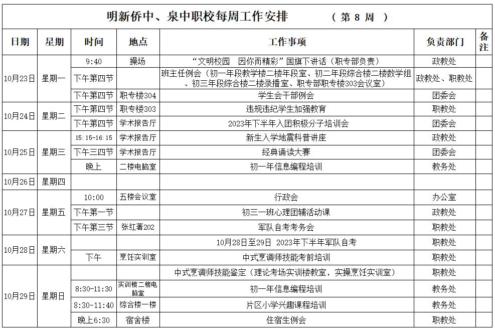 【10月(yuè)23日(rì) 星期一(yī)】 2023年(nián)秋季第8周工(gōng)作(zuò)安排