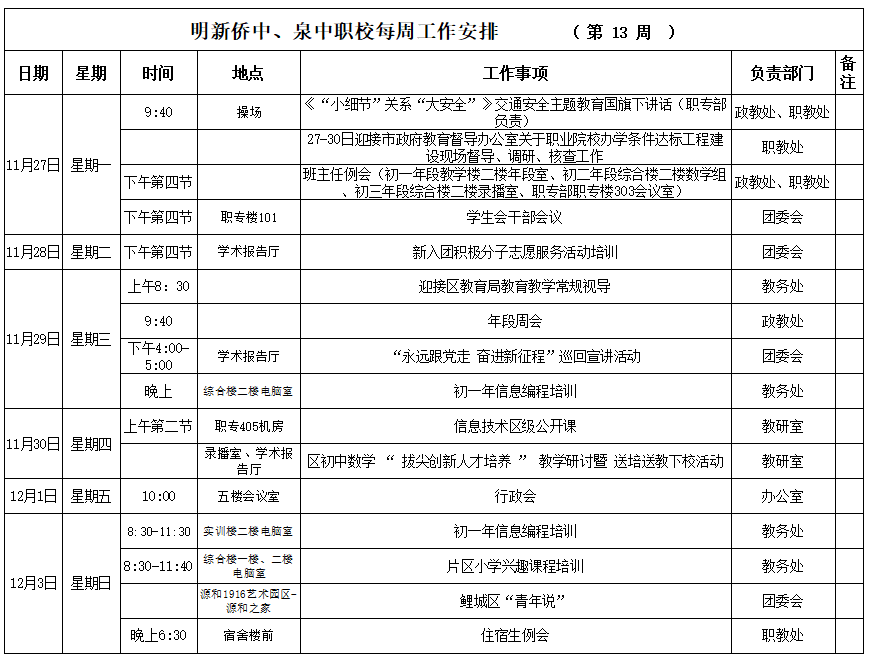 【11月(yuè)27日(rì) 星期一(yī)】 2023年(nián)秋季第13周工(gōng)作(≠zuò)安排