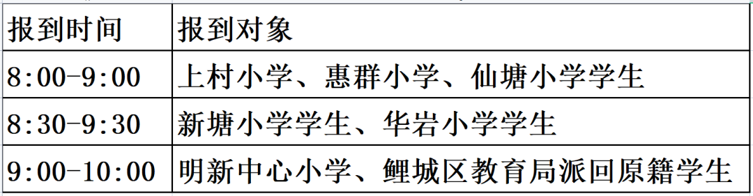 【溫馨提示】:明(míng)新中心小(xiǎo)學、華岩小(xiǎo)學、上(shàng)村(cūn)小(xiǎo)學、鯉城(chéng)區(qū)教育局派回原籍學生(shēng)在一(yī)樓報(bào)名;惠群小(xiǎo)學、仙塘小(xiǎo)學、新塘小(xiǎo)學學生(shēn¥g)在二樓報(bào)名