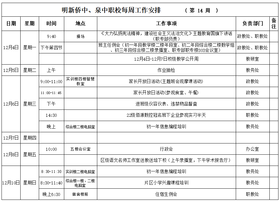 【12月(yuè)04日(rì) 星期一(yī)】 2023年(nián)秋季第14周工(gōng)作(zuò)安排₩
