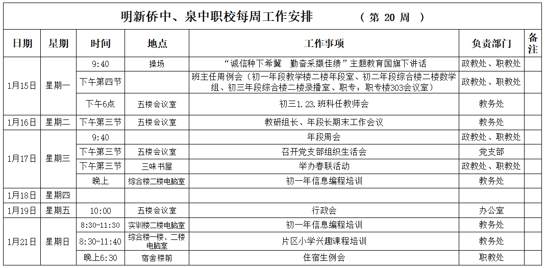 【1月(yuè)15日(rì) 星期一(yī)】 2024年(nián)秋季第20周工(gōng)作(zuò)安排