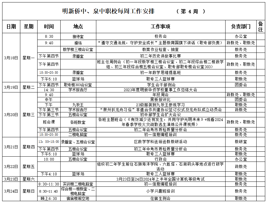 【03月(yuè)18日(rì) 星期一(yī)】 2024年(nián)春季第4周工(gōng)作(zuò)安排