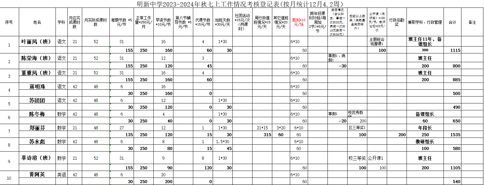 明(míng)新中學2023-2024年(nián)秋七上(shàng)工(gōng)作(zuò)情況考核登記表(按月(yuè)≠統計(jì)12月(yuè)4.2周)