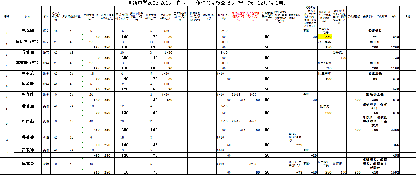 明(míng)新中學2022-2023年(nián)春八下(xià)工(gōng)作(zuò)情況考核登記表(按月(yuè)統計(j•ì)12月(yuè)(4.2周)