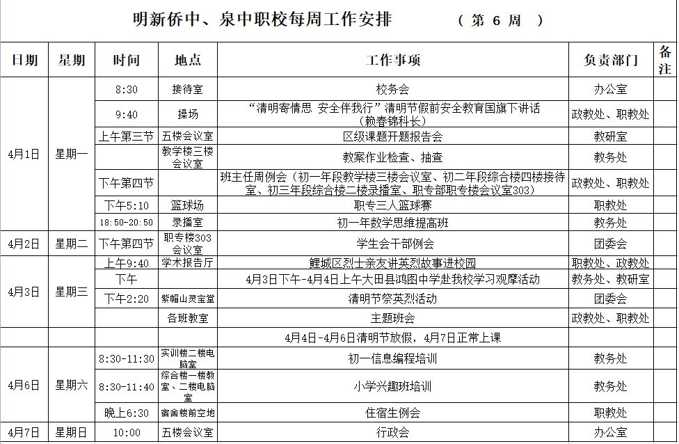 【04月(yuè)01日(rì) 星期一(yī)】 2024年(nián)春季第6周工(gōng)作(zuò)安排