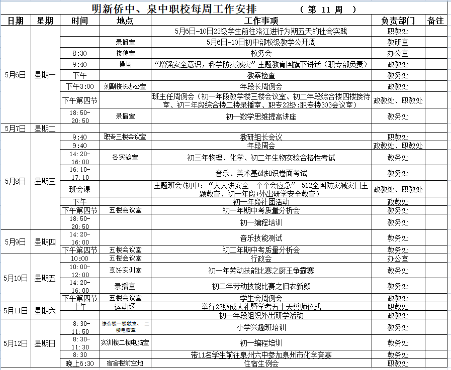 【05月(yuè)6日(rì) 星期一(yī)】 2024年(nián)春季第11周工(gōng)作(zuò)安排