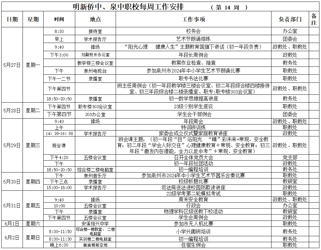 【05月(yuè)27日(rì) 星期一(yī)】 2024年(nián)春季第14周工(gōng)作(zuò)安排