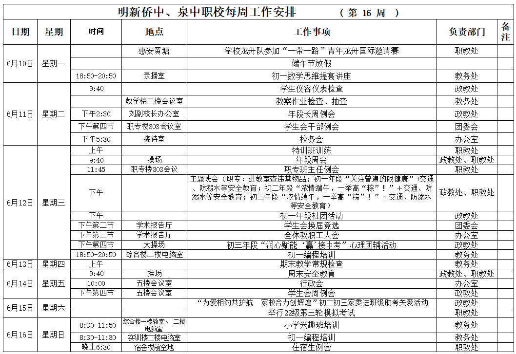 【06月(yuè)10日(rì) 星期一(yī)】 2024年(nián)春季第16周工(gōng)作(zuò)安排