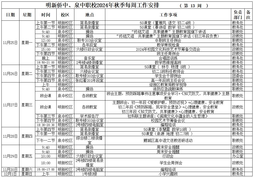 【11月(yuè)25日(rì) 星期一(yī)】 2024年(nián)秋季第13周工(gōng)作(zuò)安排