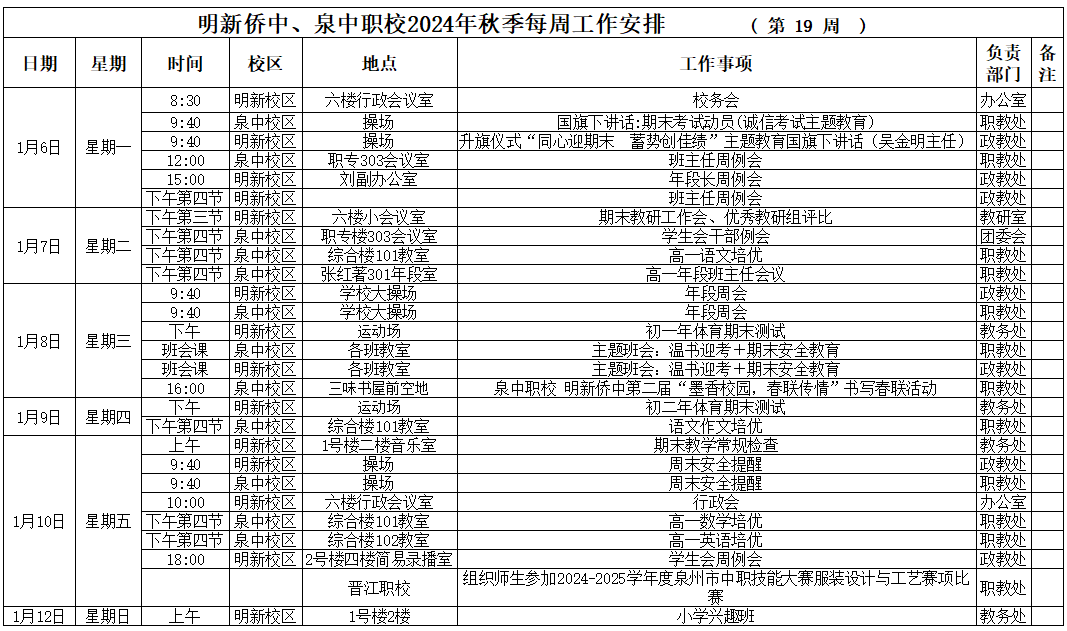 【01月(yuè)06日(rì) 星期一(yī)】 2024年(nián)秋季第19周工(gōng)作(zuò)安排
