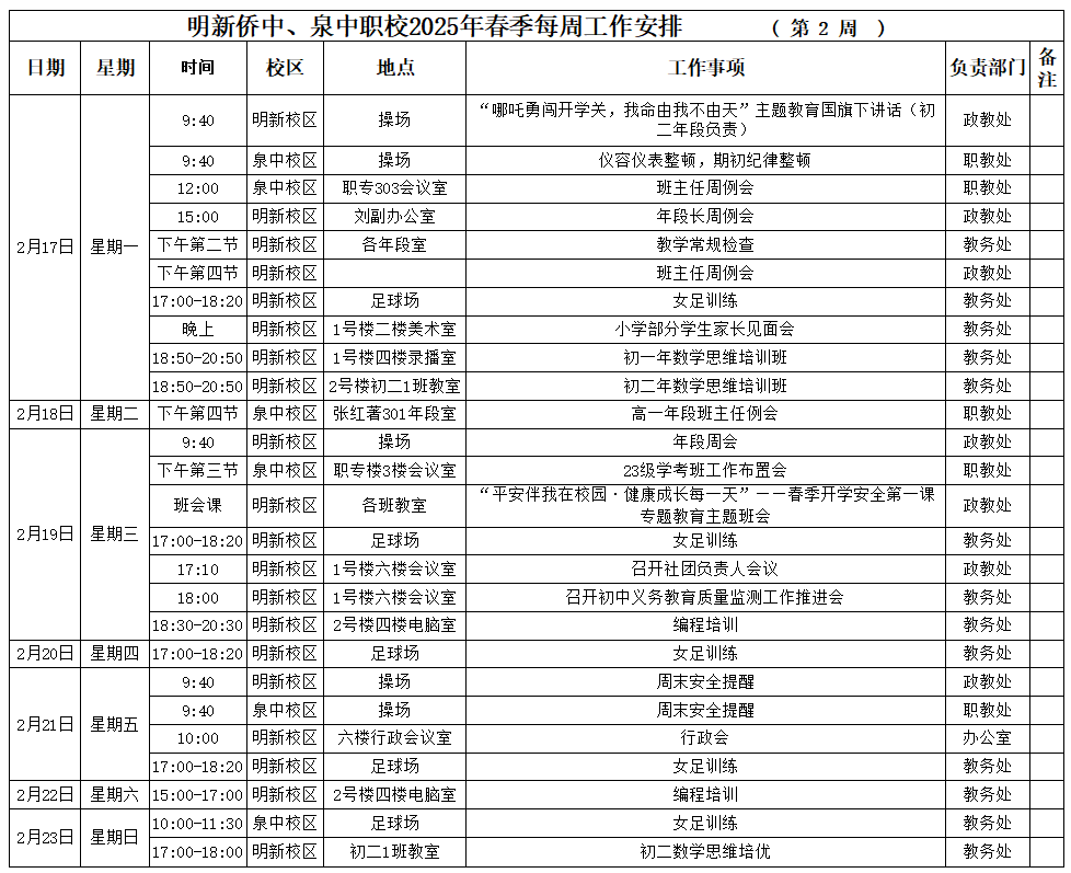 【02月(yuè)17日(rì) 星期一(yī)】 2025年(nián)春季第2周工(gōng)作(zuò)安排