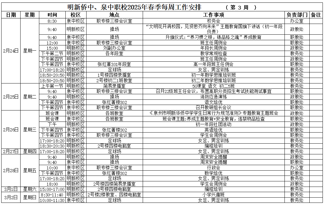 【02月(yuè)24日(rì) 星期一(yī)】 2025年(nián)春季第3周工(gōng)作(zuò)安排