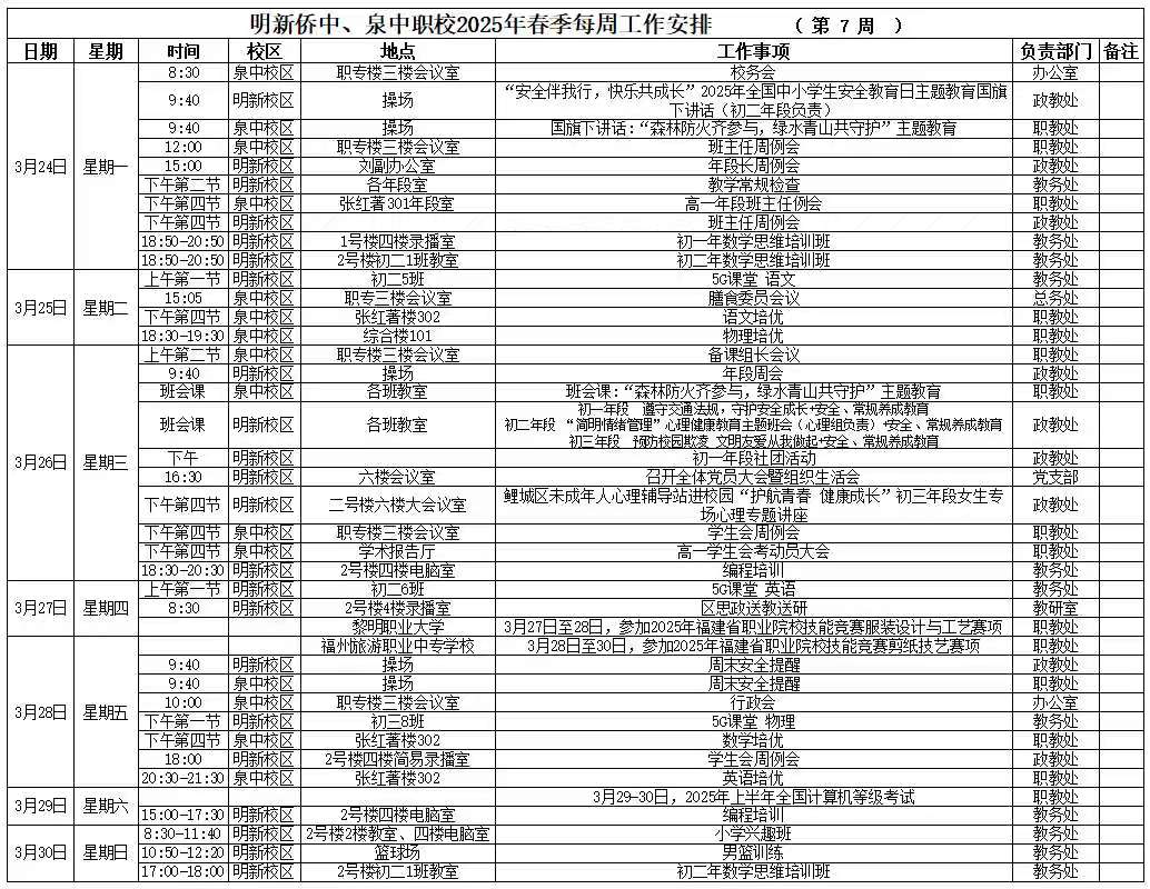 【03月(yuè)24日(rì) 星期一(yī)】 2025年(nián)春季第7周工(gōng)作(zuò)安排