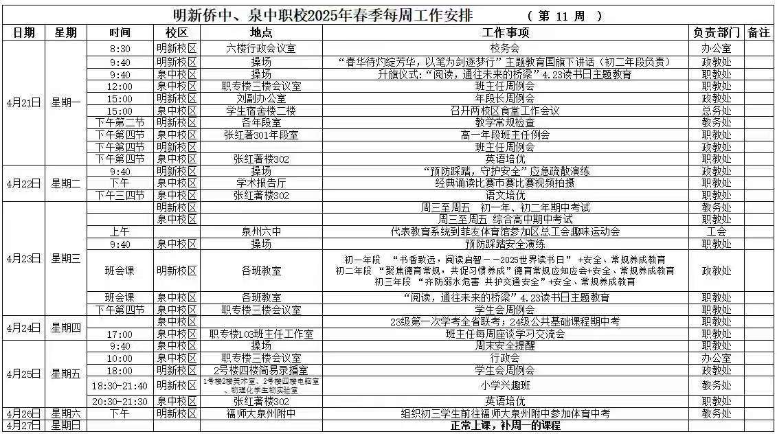 【04月(yuè)21日(rì) 星期一(yī)】 2025年(nián)春季第11周工(gōng)作(zuò)安排