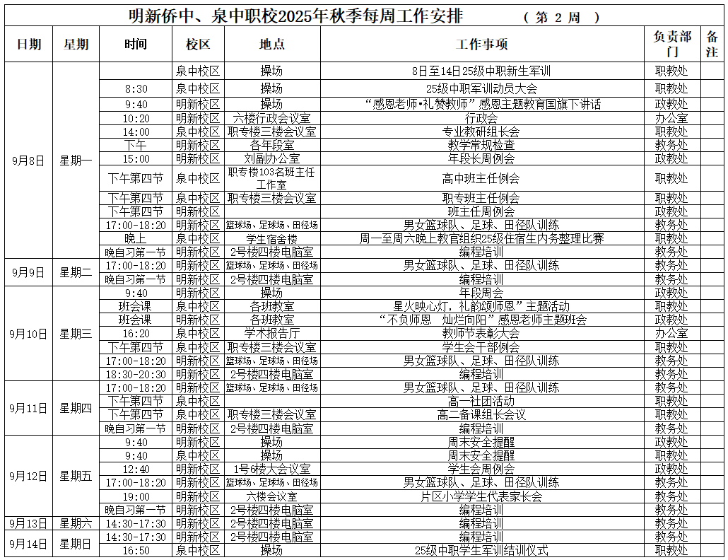 【09月(yuè)08日(rì) 星期一(yī)】 2025年(nián)秋季第02周工(gōng)作(zuò)安排