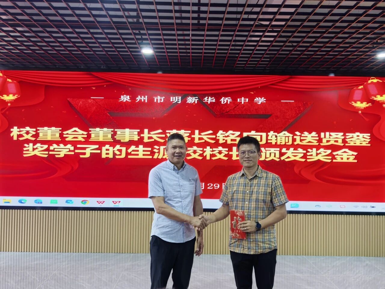 校(xiào)董會(huì)董事(shì)長(cháng)蔣長(cháng)銘向輸送賢銮獎學子(zǐ)的(de)生(shēng)源校(xiào)校(xiào)長(cháng)頒發獎金(jīn)